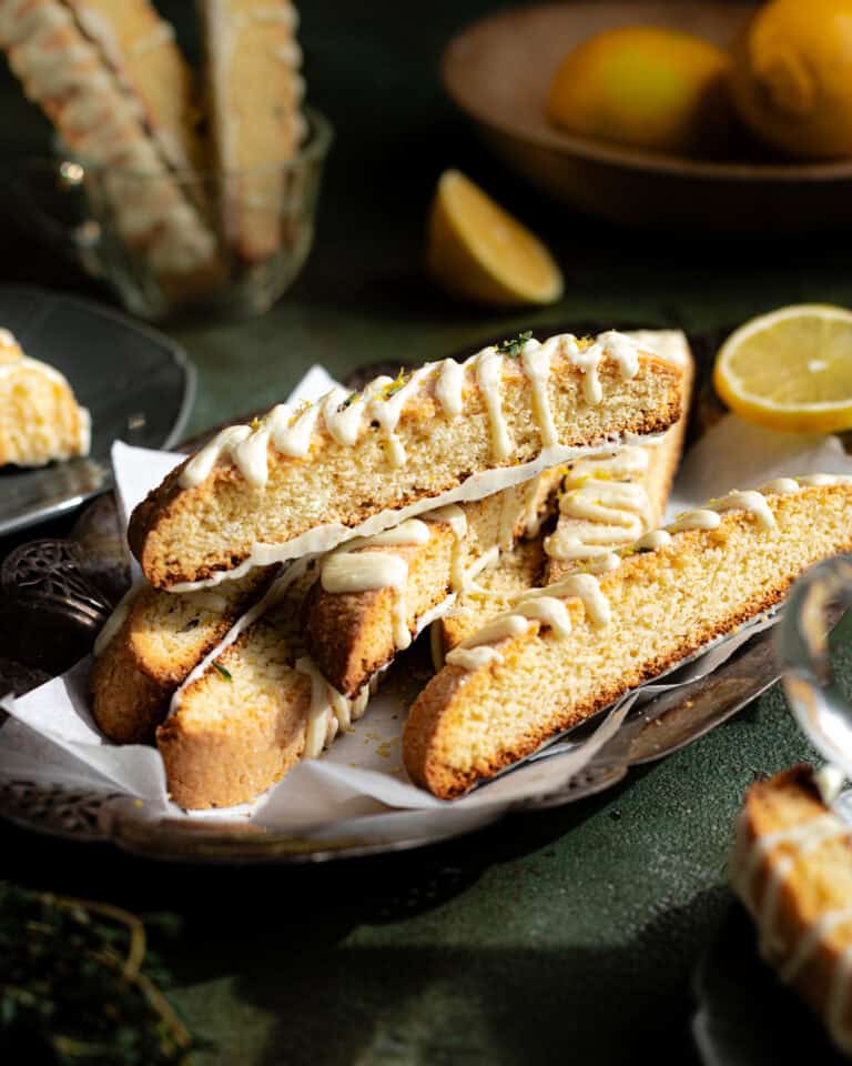 Sourdough Lemon Thyme Biscotti are light and crisp, twice baked cookies made with sourdough discard. Lemon zest and fresh thyme add a bright and herby flavor to these delicious cookies. Biscotti are the best excuse to eat dessert for breakfast and are delicious with coffee or tea.