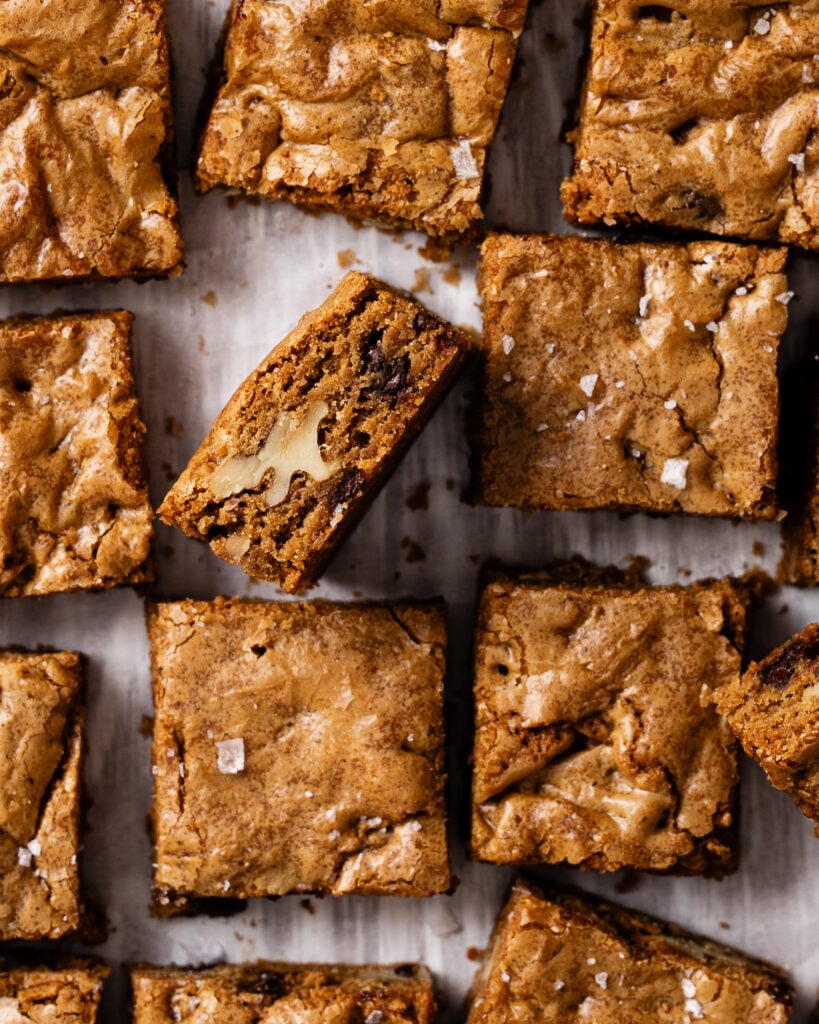 Gooey with a crackly top, and decadent brown sugar flavor, these sourdough blondies are out of this world. The flavor of sourdough adds a much-needed complexity that tames and perfectly complements the sweetness of this sugary treat.