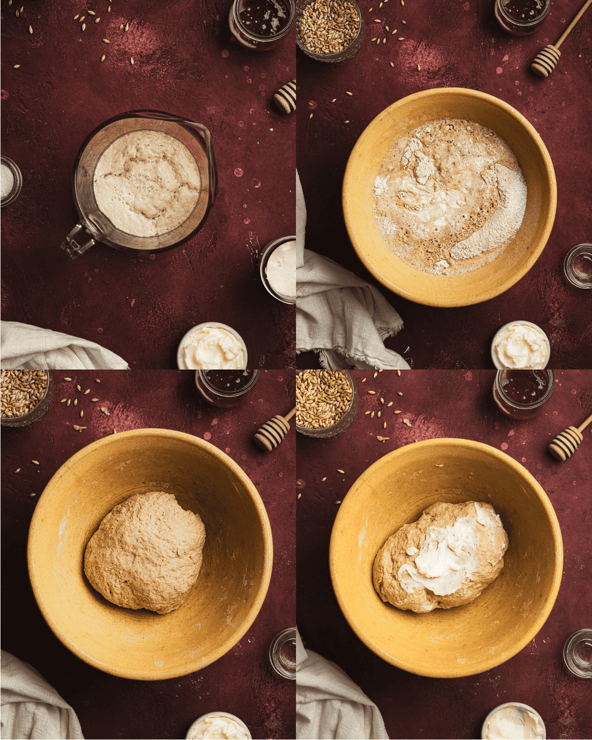 Bloom the yeast. Combine the ingredients in a large mixing bowl and mix until a cohesive dough forms. Knead the butter into the dough until its fully absorbed.